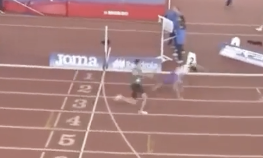 Mario Palencia xô mạnh từ phía sau khiến đối thủ mất thăng bằng, ngã xuống đường chạy nên bị loại tại giải vô địch điền kinh trong nhà U20 Tây Ban Nha 2025.