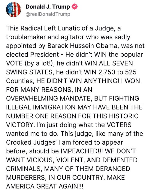 Ông Trump cho biết. Ông tuân theo lệnh toà án nhưng có nhiều quan toà xấu xí, theo phe đảng, không xử theo luật thì phải impeach vì điều đó đã được ghi trong luật.