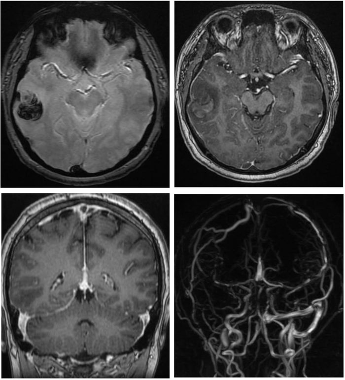 Bệnh nhân nhập viện trong tình trạng đau đầu dữ dội. Kết quả chụp CT scan cho thấy xuất huyết não, còn chụp cộng hưởng từ có bơm thuốc phát hiện huyết khối tại nhiều vị trí trong tĩnh mạch não.
