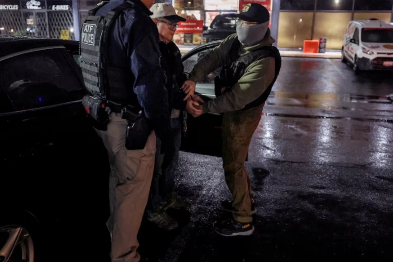 Các sĩ quan từ Cơ quan Thực thi Di trú và Hải quan Hoa Kỳ, Cục Rượu, Thuốc lá, Súng và Chất nổ, và Cơ quan Thực thi Ma túy rời đi sau khi cố gắng vào một căn hộ để truy đuổi một người đàn ông Honduras gần thành phố Rockville nhưng không thành công vào ngày 6/2/2025