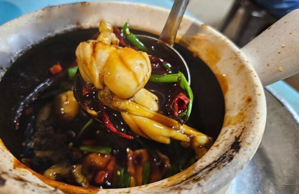 Chén cháo nóng giúp làm ấm bụng, thường được chọn thưởng thức lúc tan sở về khuya hay những ngày mưa dầm. Phần cháo được nấu mịn, dùng kèm thố ếch chưng chắc thịt. Thực khách có thể chọn cháo và ếch trộn sẵn hoặc để riêng. Ngoài ra còn có món chân ếch nấu trong nồi đất cùng ớt khô, gừng và hành lá giúp át đi vị tanh, tạo vị đặc trưng. Ảnh: Sethlui