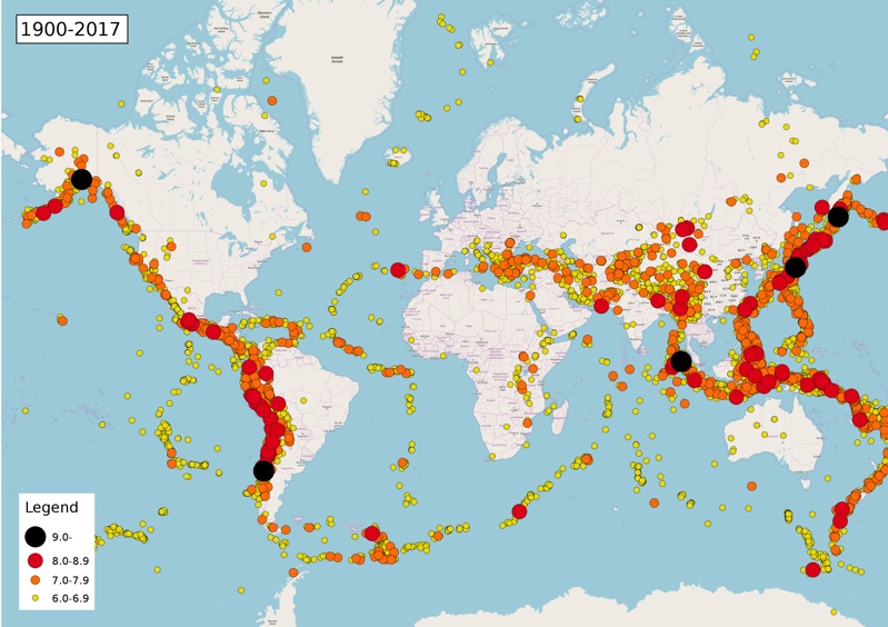 Bản đồ động đất. Nói chung là gần ŕa các thềm lục địa (viền màu vàng) th́ càng dễ xảy ra động đất. Mảnh Á-Âu là cứng nhất, từ Pháp sang Nga, Siberia gần như không bao giờ động đất.