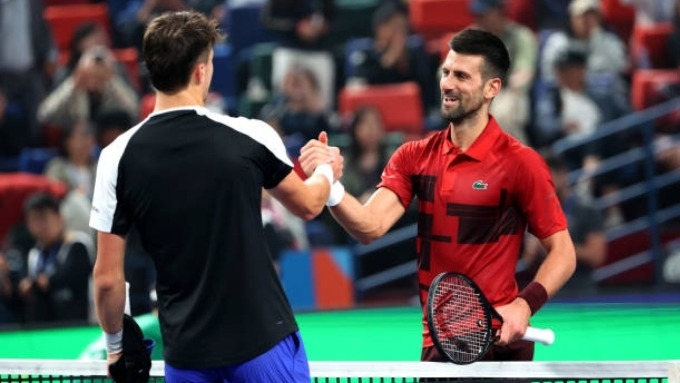 Djokovic (phải) bắt tay Mensik sau trận tứ kết Thượng Hải Masters 2024 tại Trung Quốc. Ảnh: Reuters