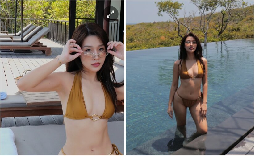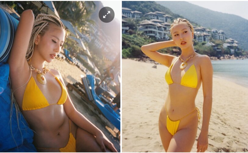 Quỳnh Anh Shyn cũng nhanh chóng khởi động mùa du lịch hè bằng loạt ảnh tắm biển ở Đà Nẵng cùng bạn trai Nam Phùng. Influencer 29 tuổi nổi bật trong bộ bikini vàng và mái tóc tết cá tính. Ảnh: @quynhanhshyn_.