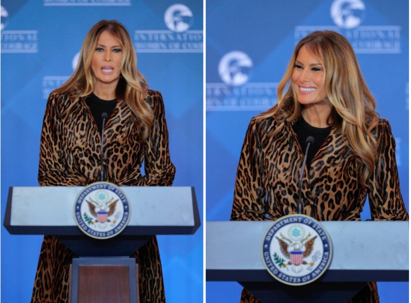 Khoác lên mình chiếc áo họa tiết da báo cao cấp, bà Melania Trump mang đến Lễ trao giải Phụ nữ can đảm quốc tế thông điệp mạnh mẽ về sức mạnh của tình yêu.