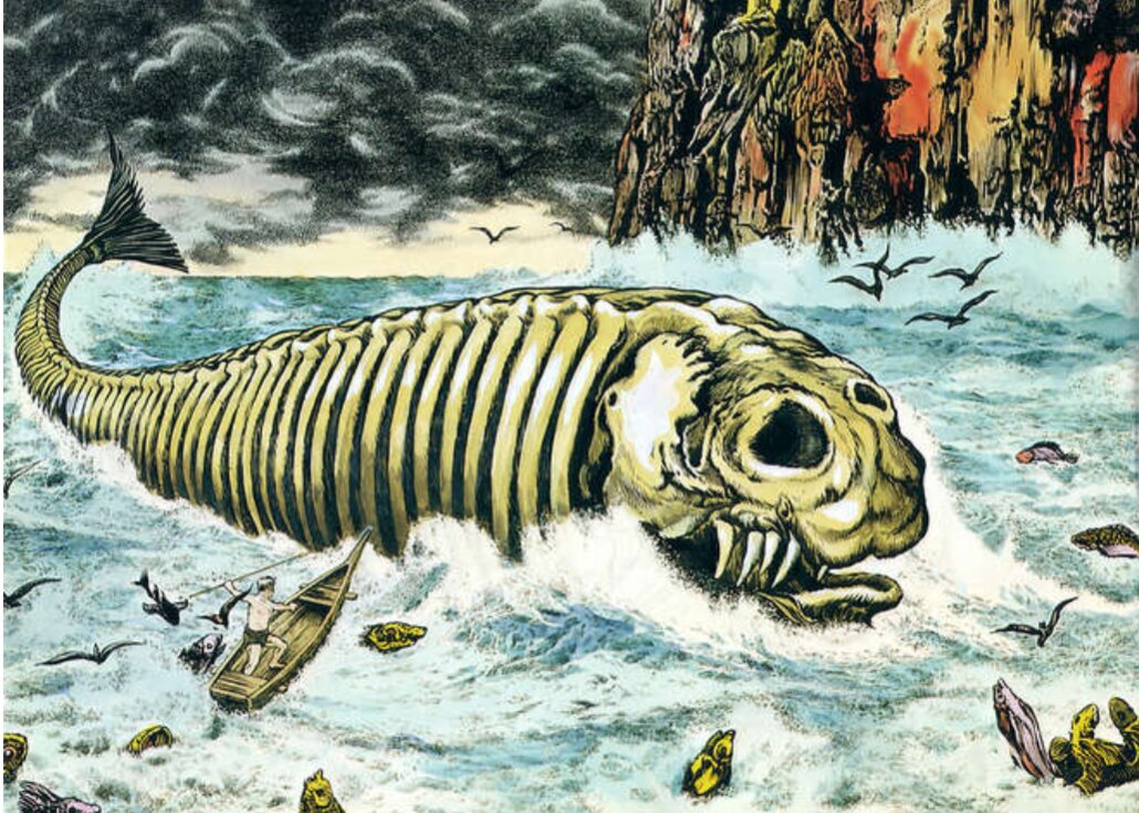 Cảm thấy kỳ lạ, đoàn dân chài bắt đầu tiến gần đến con cá voi hơn. Ra đến nơi, trước mặt họ là một cảnh tượng chưa từng chứng kiến trong đời: Một bộ xương cá voi trắng khổng lồ. Điều đáng sợ là nó không bất động, mà di chuyển như một con cá voi bình thường, chỉ có kích thước là khổng lồ hơn tất thảy.