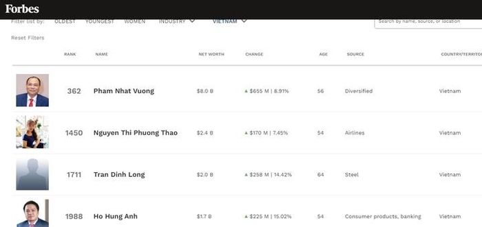 Trong khi đó, bà Nguyễn Thị Phương Thảo - Chủ tịch Vietjet đang sở hữu 2,4 tỷ USD, xếp thứ 1.450 thế giới.
