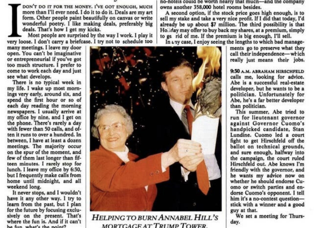 Xem bản tin về Annabel trên NBC Nightly News, ông Trump viết trong cuốn The Art of the Deal (tạm dịch: Nghệ thuật đàm phán): "Tôi thấy một câu chuyện rất buồn. Những người làm việc chăm chỉ cả đời lại mất tất cả. Điều đó thật không hay chút nào".