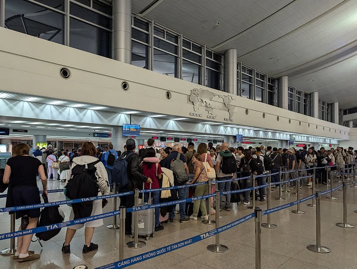 Hành khách xếp hàng dài chờ đợi tại khu vực kiểm tra xuất nhập cảnh tại Sân bay Quốc tế Tân Sơn Nhất ở TP HCM vào ngày 7/4/2025. Đây là sân bay nhộn nhịp nhất cả nước, hàng ngày tiếp nhận lượng lớn hành khách quốc tế.