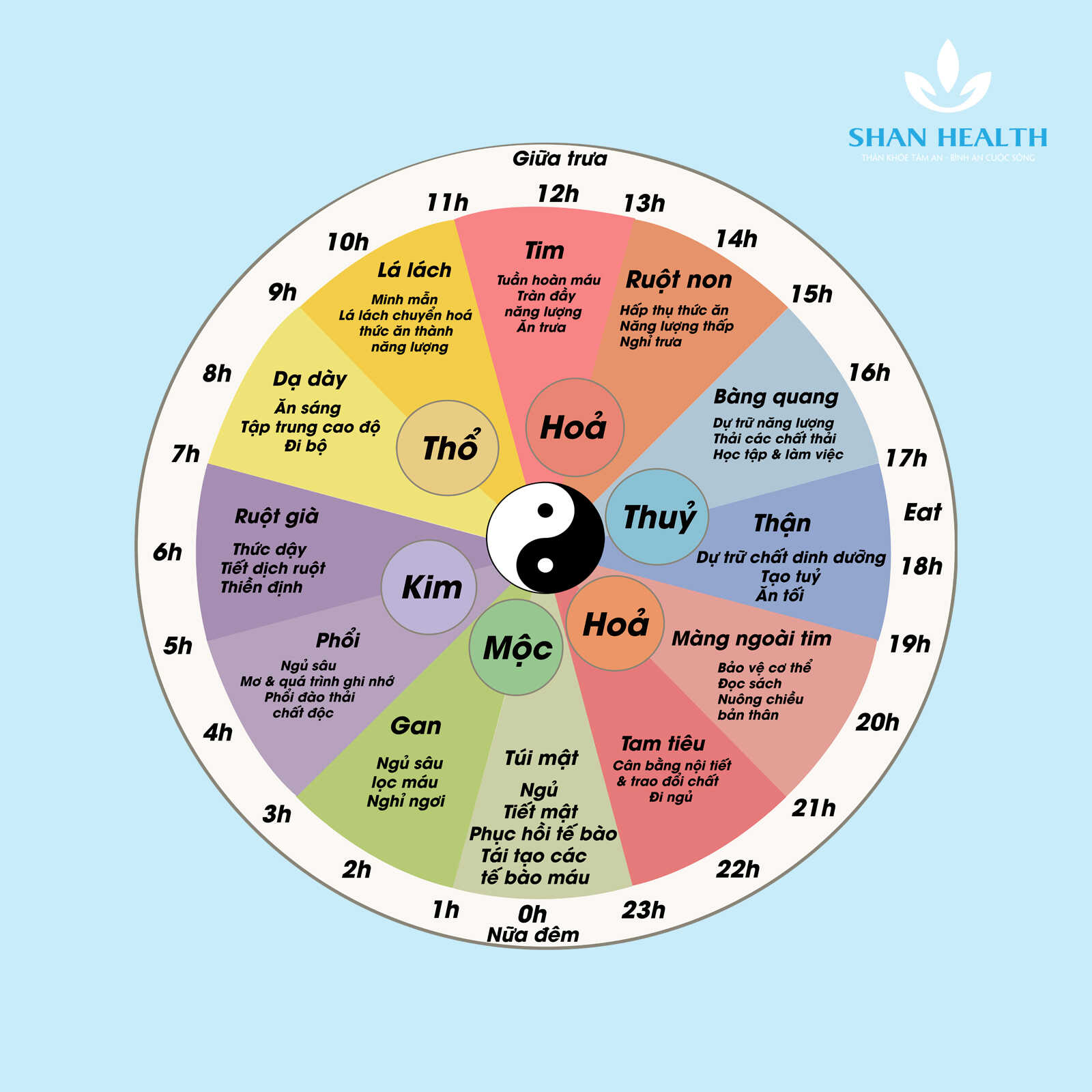 Từ 11 giờ sáng-1 giờ chiều (giờ Ngọ): Khoảng thời gian này là lý tưởng để ăn trưa, việc ngủ trưa một giờ hoặc thưởng thức một tách trà cũng được khuyến cáo trong khoảng thời gian này.