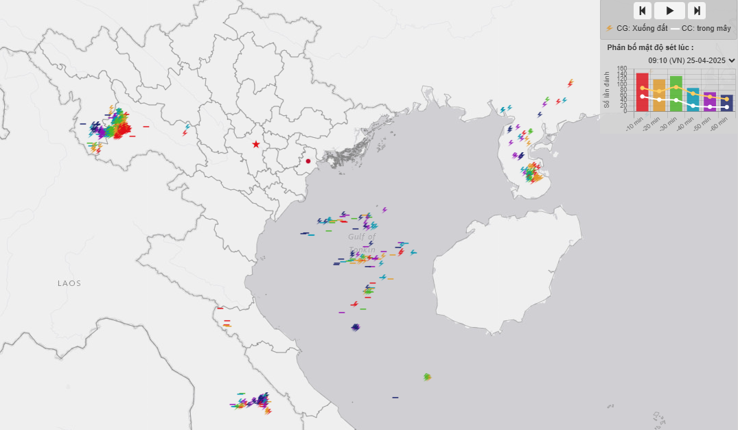 Trong khoảng từ 1h30 đến 5h ngày 25/4, ước tính có hơn 23.200 cú sét đánh xuống đất và sét đánh trong mây, trong đó có hơn 10.400 cú sét đánh xuống đất.
