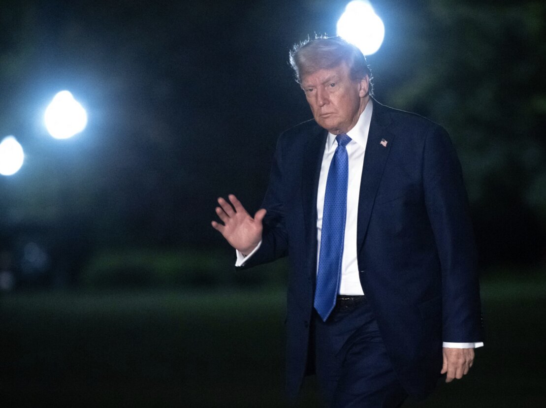 Tổng Thống Donald Trump vừa xuống trực thăng Marine One tại sân Tòa Bạch Ốc ở Washington, DC, đêm 24 Tháng Tư, 2025. (Hình: SAUL LOEB/AFP/Getty Images)