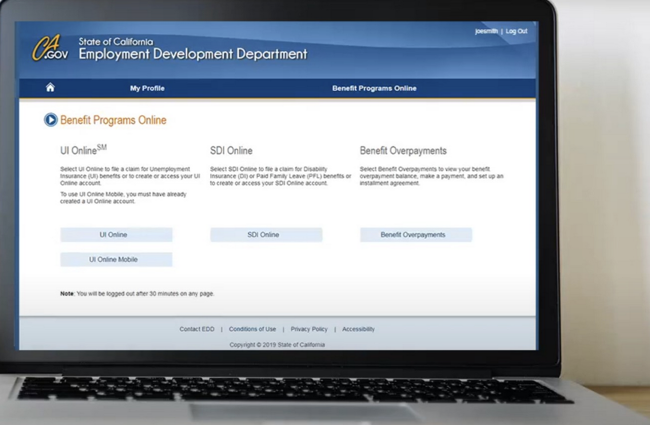 Trang web khai thất nghiệp của Sở Thất Nghiệp California (EDD). (Hình minh họa: EDD)