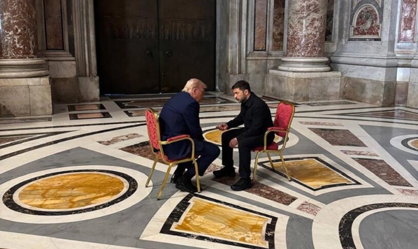 Hình ảnh được công bố cho thấy hai lãnh đạo dường như gặp nhau một cách tình cờ, ngồi đối diện nhau trên hai chiếc ghế vốn dành cho khách tới viếng Giáo hoàng tại Vương cung Thánh đường Thánh Peter ở Vatican. Ông Trump hơi nghiêng người về phía trước, chăm chú lắng nghe những gì ông Zelensky nói, trong cuộc gặp được hai bên mô tả là "hiệu quả và mang tính xây dựng".