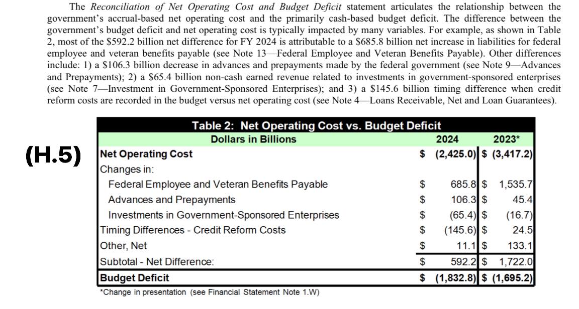 Các năm 2023-2024 nước Mỹ làm ra $27-$29 ngàn tỷ (hiểu GDP theo nghĩa giá trị gia tăng). Thu và phải thu ngân sách lần lượt: $4,5-5,0 ngàn tỷ, phải chi ngân sách: $7,7-$7,8 ngàn tỷ. Chi nhiều hơn thu: $3,4-$2,4 ngàn tỷ (H.4). Thâm hụt ngân sách $1,7-$1,8 ngàn tỷ (thâm hụt ngân sách ít hơn (Thu - Chi) v́ có những khoản phải chi nhưng chưa chi lần lượt là $1.700-$600 tỷ mỗi năm (H.5).