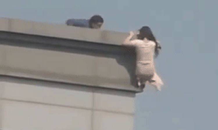 Cảnh sát đặc nhiệm Hàn Quốc đã lên nóc tòa nhà, bí mật bò đến sát vị trí cô gái đang ngồi. Vào khoảnh khắc nguy cấp nhất, một sĩ quan nhào lên, túm lấy tóc và cánh tay cô gái, trong lúc người cô treo lơ lửng trên không.