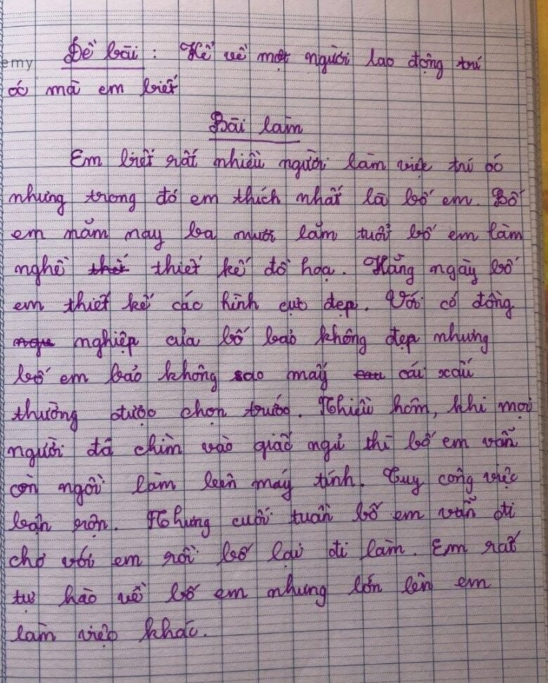 Nhận được đề bài của cô giáo yêu cầu: "Hãy kể về một người lao động trí óc mà em biết", bé học sinh đã nhớ ngay đến người bố thân yêu của mình. Toàn bộ tác phẩm dài gần một trang giấy của nhóc tỳ đều dành những lời “có cách” cho bố, thể hiện rõ sự tự hào của đứa trẻ về bố. Tất cả đều là dòng cảm xúc chân thật nhất, nhưng đọc bài văn từ đầu đến gần cuối đang “cảm động”, thì câu kết của đứa trẻ khiến nhiều người “cảm lạnh”.