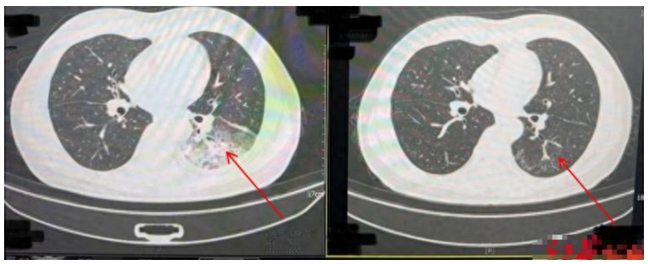 Ảnh chụp CT trước khi điều trị cho thấy nửa lá phổi trái của ông Lý trắng xóa (bên trái) và ảnh chụp CT phổi sau khi điều trị khỏi (bên phải).