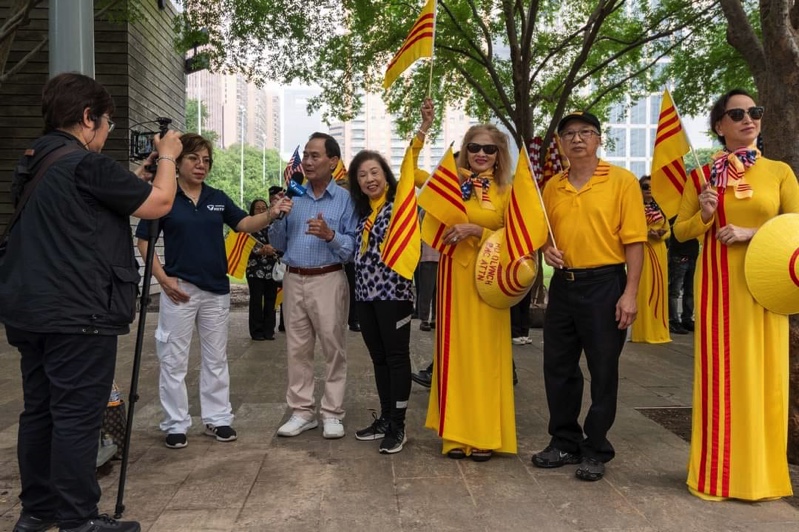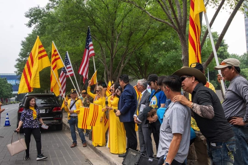 Sau đây là một số hình ảnh của đồng bào được hướng dẫn bởi Hội Đồng Đại Diện NVQG Houston tổ chức, giương cao cờ chính nghĩa Việt Nam trước nơi chúng triển lãm.