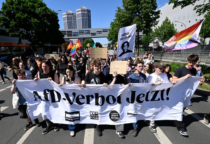 Biểu tình kêu gọi cấm đảng cực hữu AfD tại thành phố Essen, Đức ngày 11/5. Ảnh: AFP