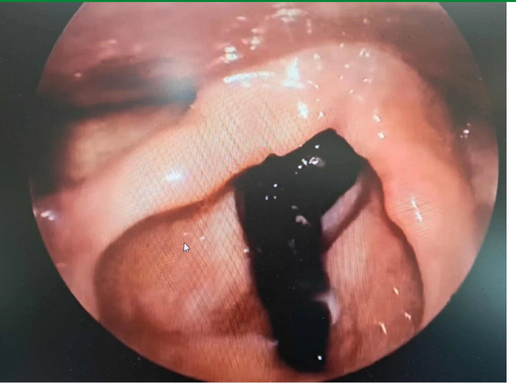 Gia đình đưa bé đến bệnh viện huyện. Tại đây, bác sĩ nghi ngờ bé có dị vật trong khí quản nên chuyển lên Bệnh viện Tai Mũi Họng Trung ương.