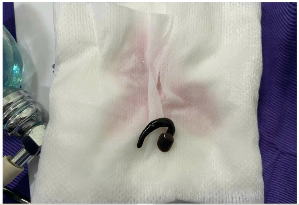 Các bác sĩ đã gây mê và nội soi gắp dị vật ra. Đó là một con đỉa suối còn sống, dài khoảng 5cm. Hiện tại, sức khỏe bé đã ổn định, không còn các triệu chứng cũ và đã được xuất viện.