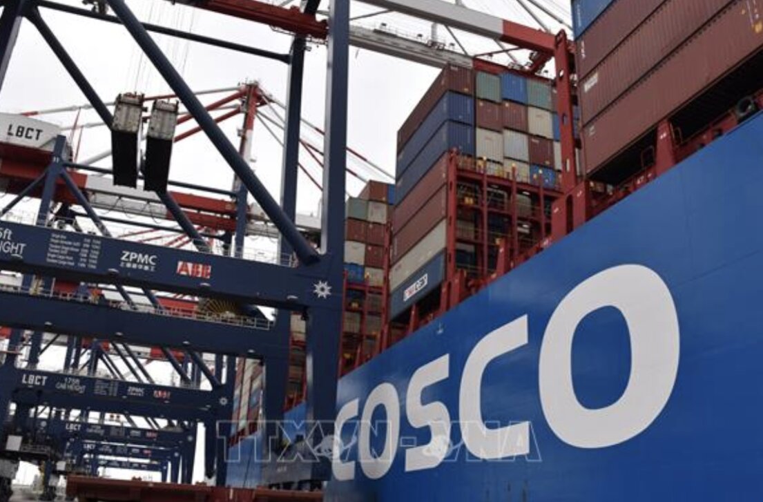 Tàu chở hàng của hãng vận tải Trung Quốc COSCO neo tại cảng Long Beach, bang California, Mỹ. Ảnh: THX/TTXVN