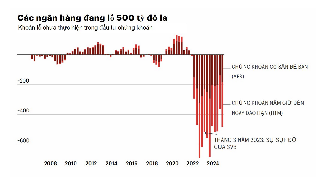 Khoản lỗ chưa thực hiện này từng lên tới 515 tỷ USD vào thời điểm SVB bị rút tiền hàng loạt vào tháng 3/2023 và đỉnh điểm là 684 tỷ USD vào cuối năm đó. Dữ liệu quý 1/2025 dự kiến sẽ được công bố trong tuần này. Nhưng lợi suất trái phiếu tăng đột biến trong tháng 4 khiến bất kỳ tín hiệu cải thiện nào trong 3 tháng đầu năm có thể chỉ mang tính tạm thời.