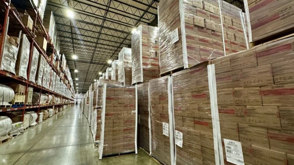 Những kiên hàng chứa các hộp Plumpy'Nut trong một nhà kho ở Rhode Island sau khi USAID cắt giảm tiền tài trợ buộc tổ chức bất vụ lợi Edesia phải cho ngừng các chuyến hàng. (Ảnh: Edesia)