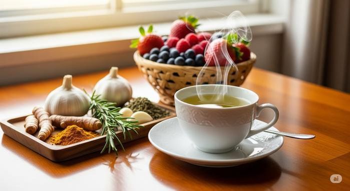 Uống trà như trà xanh, trà ô long và ăn các loại quả mọng, gia vị chứa nhiều chất chống oxy hóa sẽ giúp bạn có thể chất trẻ hơn so với tuổi - Minh họa AI: Thu Anh