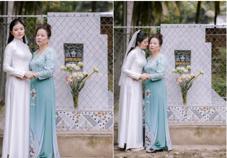 Hình ảnh cô dâu và mẹ ruột chụp ảnh bên mộ cha gây xúc động