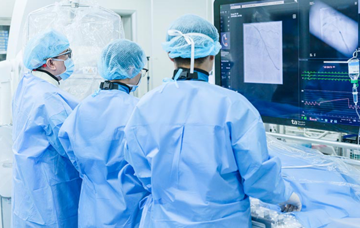 Êkíp bác sĩ cùng GS.TS.BS Võ Thành Nhân, Giám đốc Trung tâm Tim mạch Can thiệp, chụp mạch vành số hóa xóa nền (DSA) xác nhận hai vị trí hẹp nặng tại động mạch liên thất trước. Bác sĩ đặt hai stent với kích thước 2,5×38 mm nhằm mở rộng lòng mạch, xử trí tình trạng hẹp nghẽn dòng máu lưu thông đến tim.