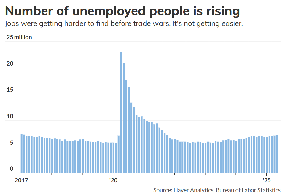 Số lượng người thất nghiệp hiện đang ở mức cao nhất kể từ năm 2021, khi Hoa Kỳ vẫn đang phục hồi hàng triệu việc làm đã mất khi đại dịch do virus corona bùng phát. Đây là con số cao nhất kể từ tháng 2 năm 2017 nếu không tính đến thời kỳ đại dịch.
