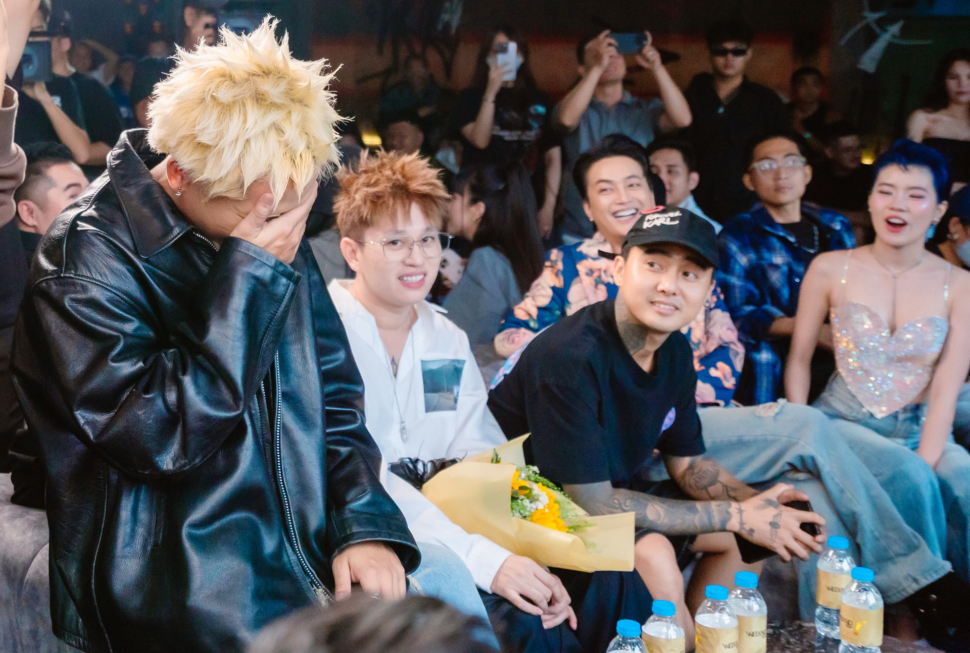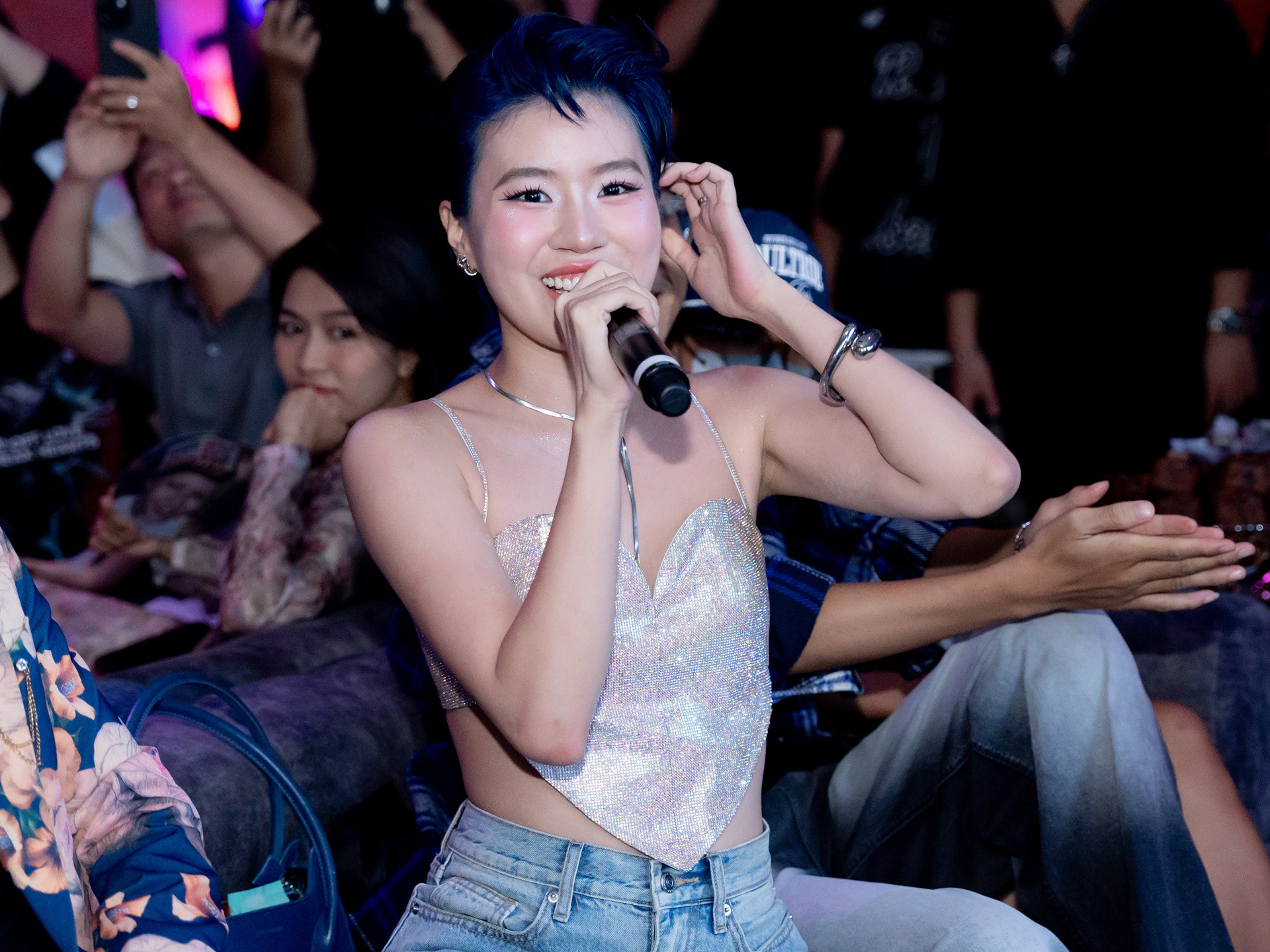 Rapper Pháo mặc sexy đến mừng đàn anh. Cô nhận xét Ricky Star rap dễ nghe, rõ lời, chúc anh giữ được ngọn lửa với đam mê âm nhạc.