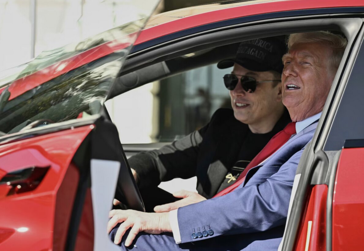 Tổng thống Donald Trump và ông Elon Musk trong chiếc Model S Tesla tại bãi cỏ Nhà Trắng hôm 11-3. Ảnh: AP