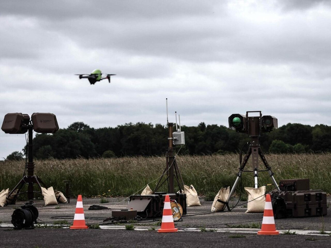 Một chiếc drone bay trước hệ thống Hệ thống Bảo vệ Chống Drone Modular trong một buổi tŕnh diễn được tổ chức bởi tập đoàn hàng không vũ trụ và quốc pḥng đa quốc gia của Pháp, Thales, tại Brétigny-sur-Orge, phía nam của Paris vào ngày 27 tháng 5 năm 2025. AFP - THIBAUD MORITZ