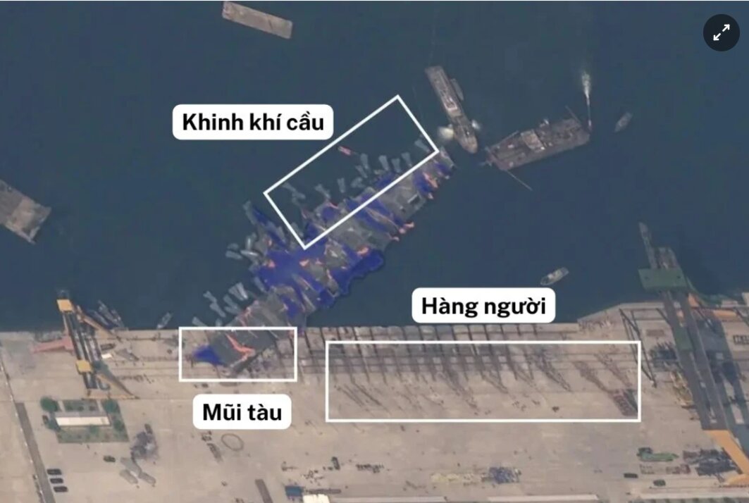 Ảnh vệ tinh chụp ngày 29/5 cho thấy hàng trăm người đứng dọc bến cảng, bên cạnh các hàng dây cáp dường như nối với con tàu.