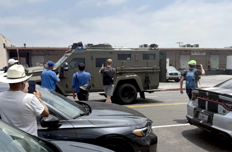 Đặc vụ ICE sử dụng xe thiết giáp truy quét người nhập cư tại Los Angeles hôm 6/6. Ảnh: Los Angeles Times