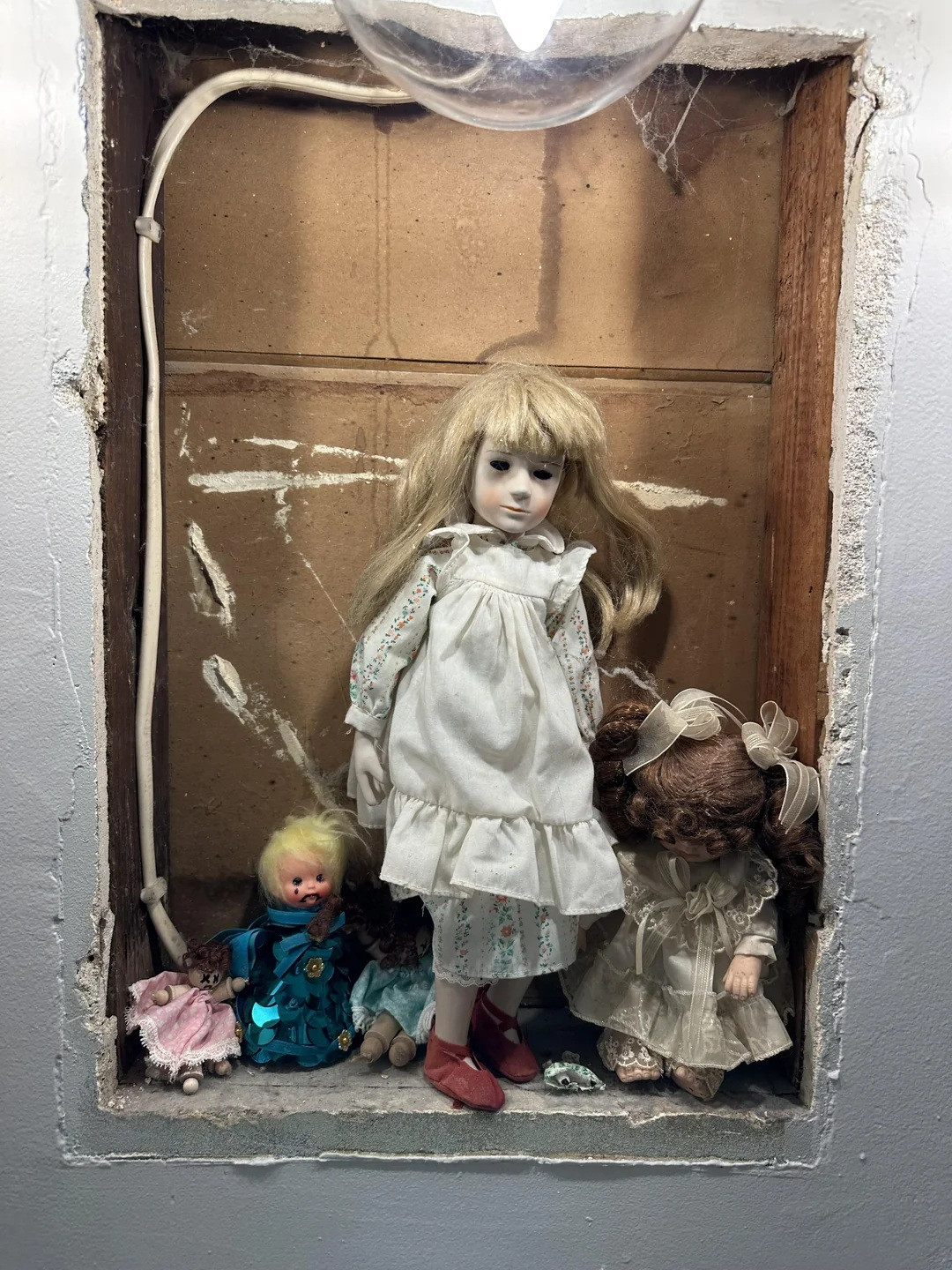 Theo Express Newspapers, trong lúc đang sửa điện trong phòng tắm, người chủ nhà đã vô tình tháo tấm gương và bất ngờ nhìn thấy một không gian nhỏ phía sau. Tại đó, có tới năm con búp bê với vẻ ngoài đáng sợ được giấu kín.