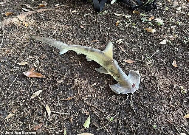 Ông Jonathan Marlowe giơ con cá búa nhỏ lên, nó đã chết khi được thả xuống gần nơi ông đang chơi đĩa golf với bạn bè.