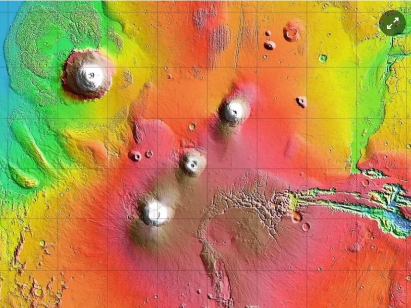 Arsia Mons là ngọn núi lửa nằm phía nam nhất trong ba ngọn núi tạo nên dãy Tharsis Montes, được hiển thị ở trung tâm bản đồ địa hình sao Hỏa (đã cắt gọn). Ở góc trên bên trái là Olympus Mons - núi lửa lớn nhất trong Hệ Mặt Trời. Phía dưới bên phải là điểm khởi đầu của hẻm núi khổng lồ Valles Marineris, nơi bắt đầu cắt ngang bề mặt hành tinh. Ảnh: NASA/JPL-Caltech/ASU.