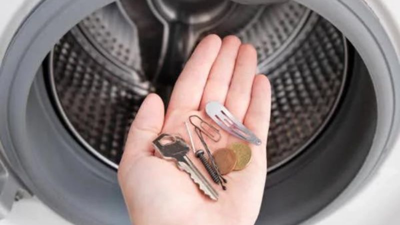 Đầu tiên trong danh sách là các vật dụng kim loại nhỏ như tiền xu, chìa khóa, kẹp giấy. Khi bị bỏ quên trong túi quần áo, chúng va đập liên tục vào thành lồng giặt, gây trầy xước, móp méo và thậm chí có thể làm nứt vỡ cửa kính của máy. Tệ hơn, chúng có thể lọt qua các khe thoát nước, kẹt vào bộ lọc hoặc các bộ phận chuyển động, gây hỏng hóc nghiêm trọng. Giải pháp phòng tránh rất đơn giản: luôn tạo thói quen kiểm tra kỹ toàn bộ túi quần, túi áo trước khi cho đồ vào máy.