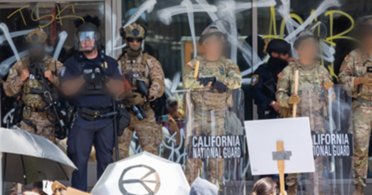 Lực lượng Vệ binh Quốc gia California bảo vệ Tòa nhà Liên bang ở Los Angeles khỏi những kẻ bạo loạn ủng hộ người nhập cư bất hợp pháp, hình ảnh qua ICE, ngày 11 tháng 6 năm 2025.