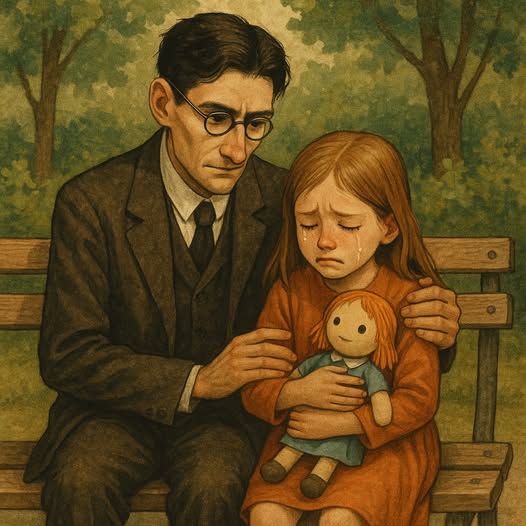 Một người đàn ông gầy gò, ánh mắt nghiêm nghị nhưng chan chứa lòng tốt, tiến lại gần em. Đó là Franz Kafka.