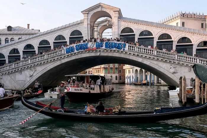 Một chiều oi ả tháng 6, gần chân cầu Rialto, nhóm thanh niên Venice tự xưng thất nghiệp tụ tập phản đối đám cưới sắp diễn ra của tỷ phú Jeff Bezos và Lauren Sanchez.
