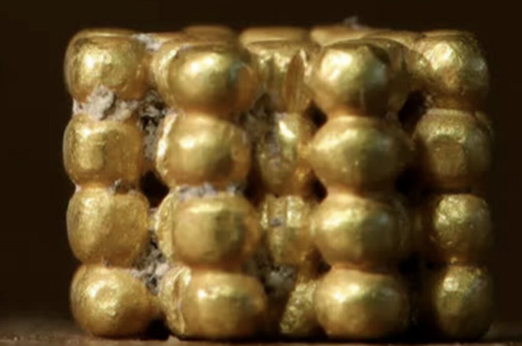 Nhà khảo cổ học nhận định, hạt vàng này được tạo thành từ nhiều hạt tròn nhỏ, kết nối lại với nhau theo hình thức giống như bông hoa và xếp chồng lên nhau, tạo thành hạt cườm có thể được dùng để làm dây chuyền hoặc vòng tay.
