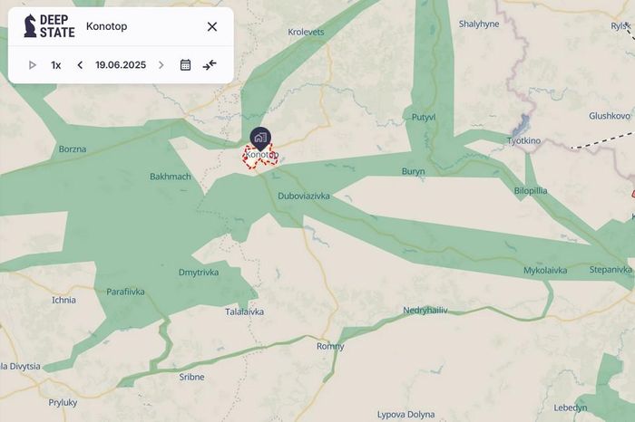 Theo bản đồ từ trang Deep State của Ukraine, thành phố Konotop nằm cách đường biên giới Nga – Ukraine khoảng 50km về phía tây.
