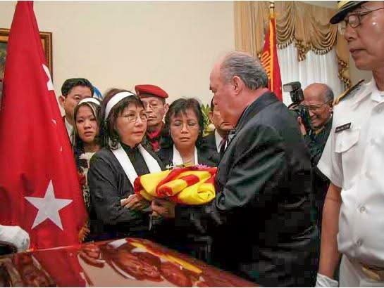Hình 3: Quốc Kỳ VNCH được Cựu Thiếu Tướng Phan Hòa Hiệp trang trọng trao lại cho Bà Quả Phụ Ngô Quang Trưởng trong Tang Lễ