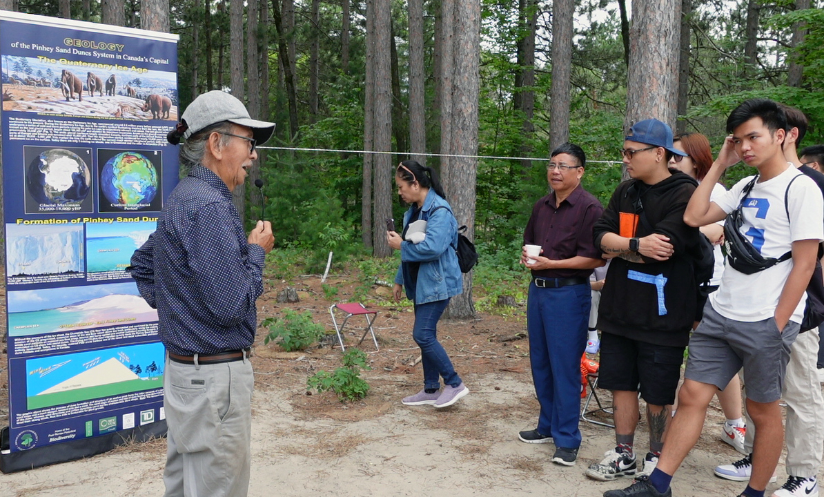 Anh Griffin Wright-Brown, Nghiên cứu sinh môi trường đô thị của Đại học Ottawa (bên phải) đang giới thiệu cho du khách về sinh vật sống được khôi phục tại đồi cát Pinhey.