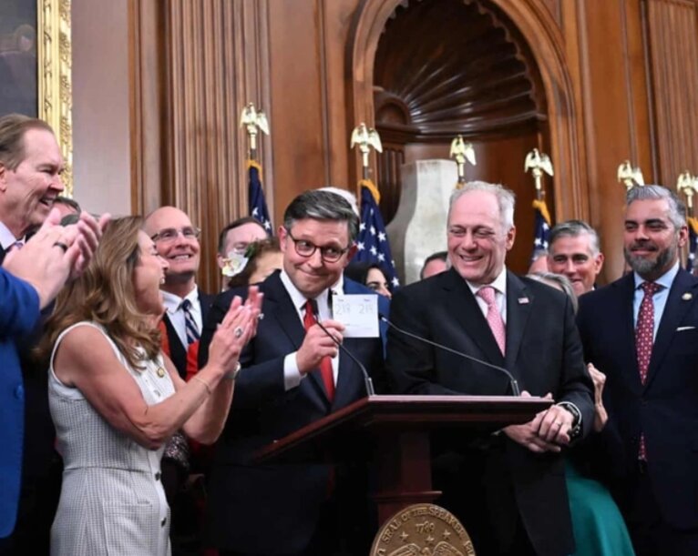 Chủ tịch Hạ viện Mỹ Mike Johnson (giữa) cùng các nghị sĩ đảng Cộng hòa mừng việc thông qua dự luật do Tổng thống Trump ủng hộ